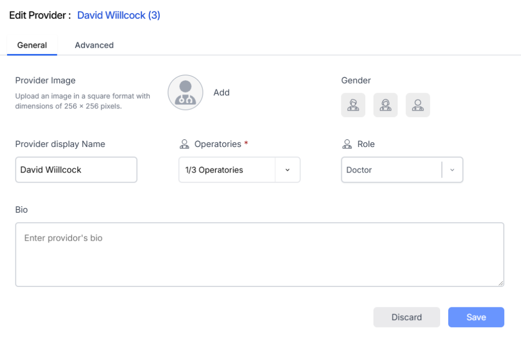 The Edit Provider section offers an update feature for the provider’s profile, allowing you to assign koperatories, upload or update photos, add a bio, and specify gender.