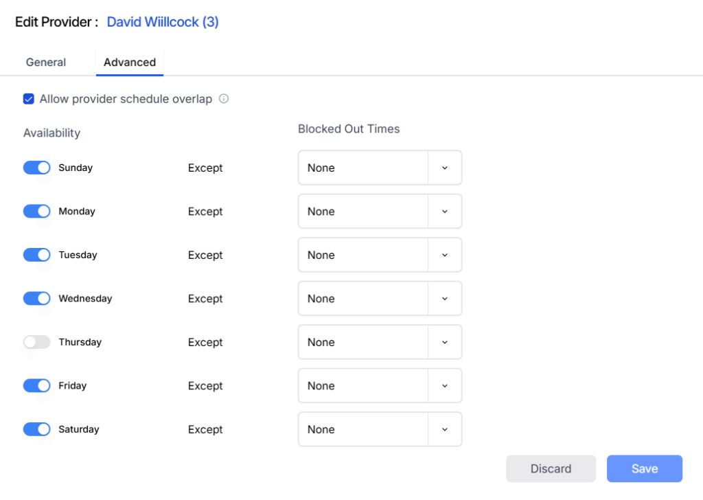 - If switched on, the provider is available for that day, and the Blocked Out Times dropdown allows users to specify unavailable time slots. This serves as an additional filter alongside the schedules from the PMS.