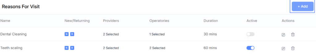 In the Active column, a toggle feature allows you to enable or disable the reason for visit. If this feature is turned off, the reason for visit will be temporarily deactivated.