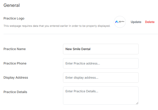 The General section allows you to add and update information displayed on the patient form, including the practice logo, practice name, contact number, display address, and other relevant details about the practice. This helps ensure that the patient form accurately reflects the practice’s branding and contact information.