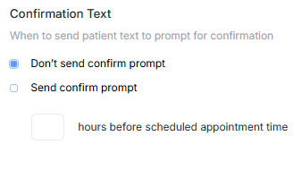 If “Don’t send confirm prompt” is enabled, no confirmation text will be sent to patients. However, if “Send confirm prompt” is enabled, patients will receive a confirmation text from the practice before their scheduled appointment, based on the time specified in the time section.