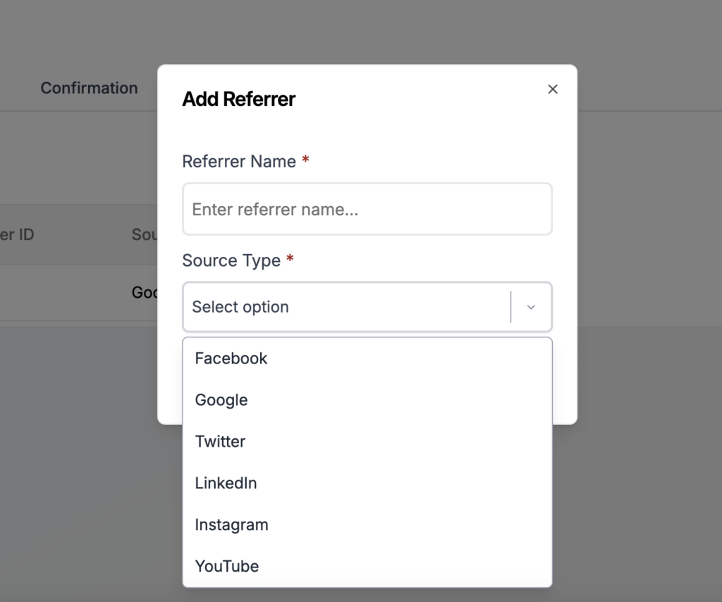 Referrer Name : In the “Name” section, enter the name of the referrer. This helps identify the origin of the referral for monitoring and reporting purposes.