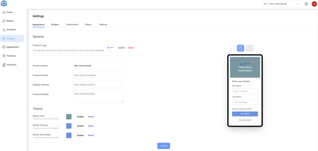On the right side of the Appearance tab, you will find a Preview section. This feature allows you to visualize how the added data and styles will appear on the patient form before saving the appearance settings.