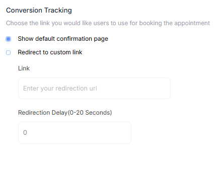 Redirect to custom link : If the Redirection feature is enabled, the patient will be redirected to the specified link after the confirmation page, following the entered duration. This feature allows you to direct patients to another page or resource after their appointment is confirmed, offering additional information or actions as needed.