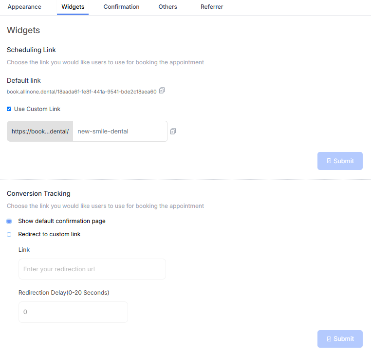 The Widgets tab displays the default link used by patients to access the patient form. It also allows users to generate a customized form link that patients will use to book appointments. Additionally, this tab provides a feature to redirect patients to other websites or resources after successfully booking an appointment, offering more flexibility in the booking process and post-appointment engagement.