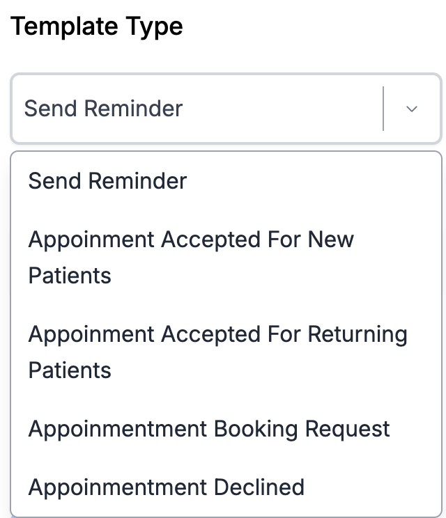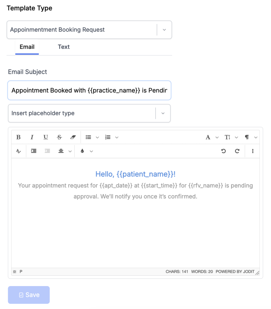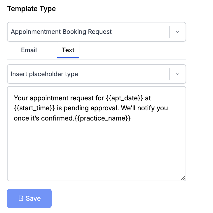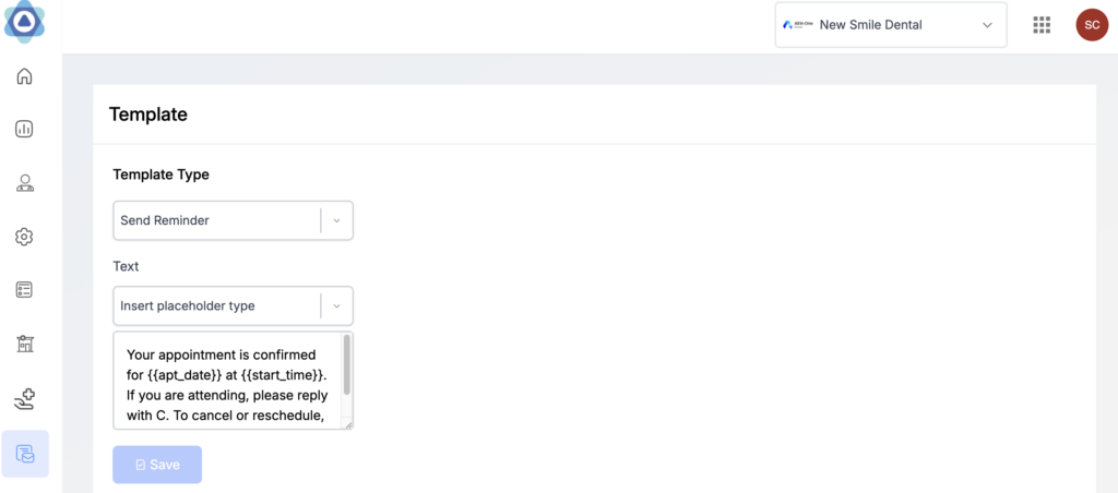 Insert Placeholder Type: The “Insert Placeholder Type” feature allows you to dynamically include appointment-related information, such as patient name, reason for visit in the text content.